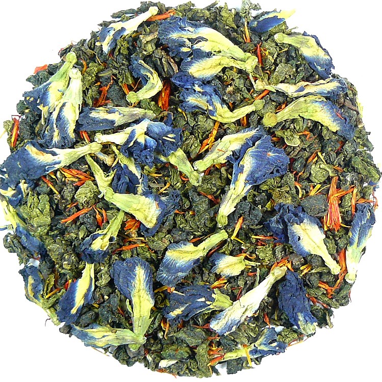 Groene thee met de butterfly blue, rozenblaadjes, rode korenbloem, zonnebloem en aroma.