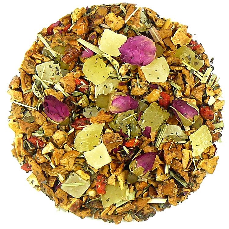 Ingrediënten: appel, mango, ananas, goji, citroengras, pepermunt, rozenknoppen, aroma