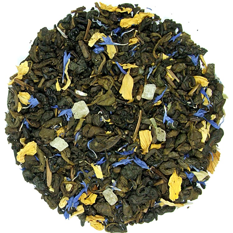 Een exotische witte thee, groene thee, kers, ananas, lemongrass, frambozenblad, zonnebloembloesem, lemon myrte, rabarber, peer en aardbei.