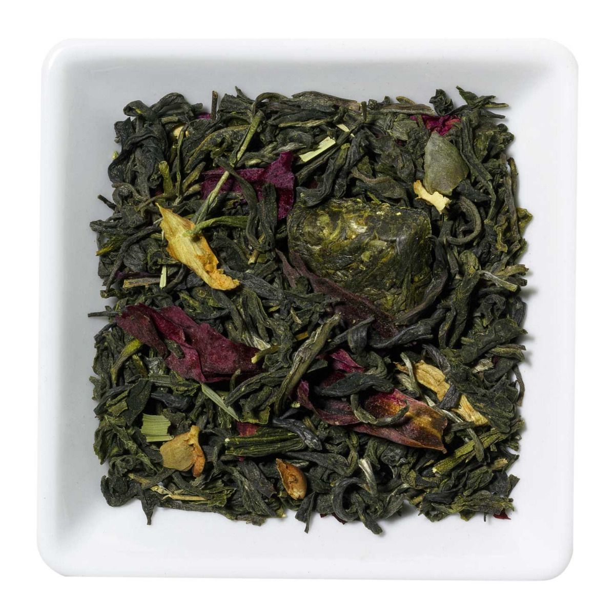 Bijzondere en lekkere Chinese blend van witte en groene thee, theetegeltjes, lychee en lemon. Van de theetegeltjes een mespuntje gebruiken.
